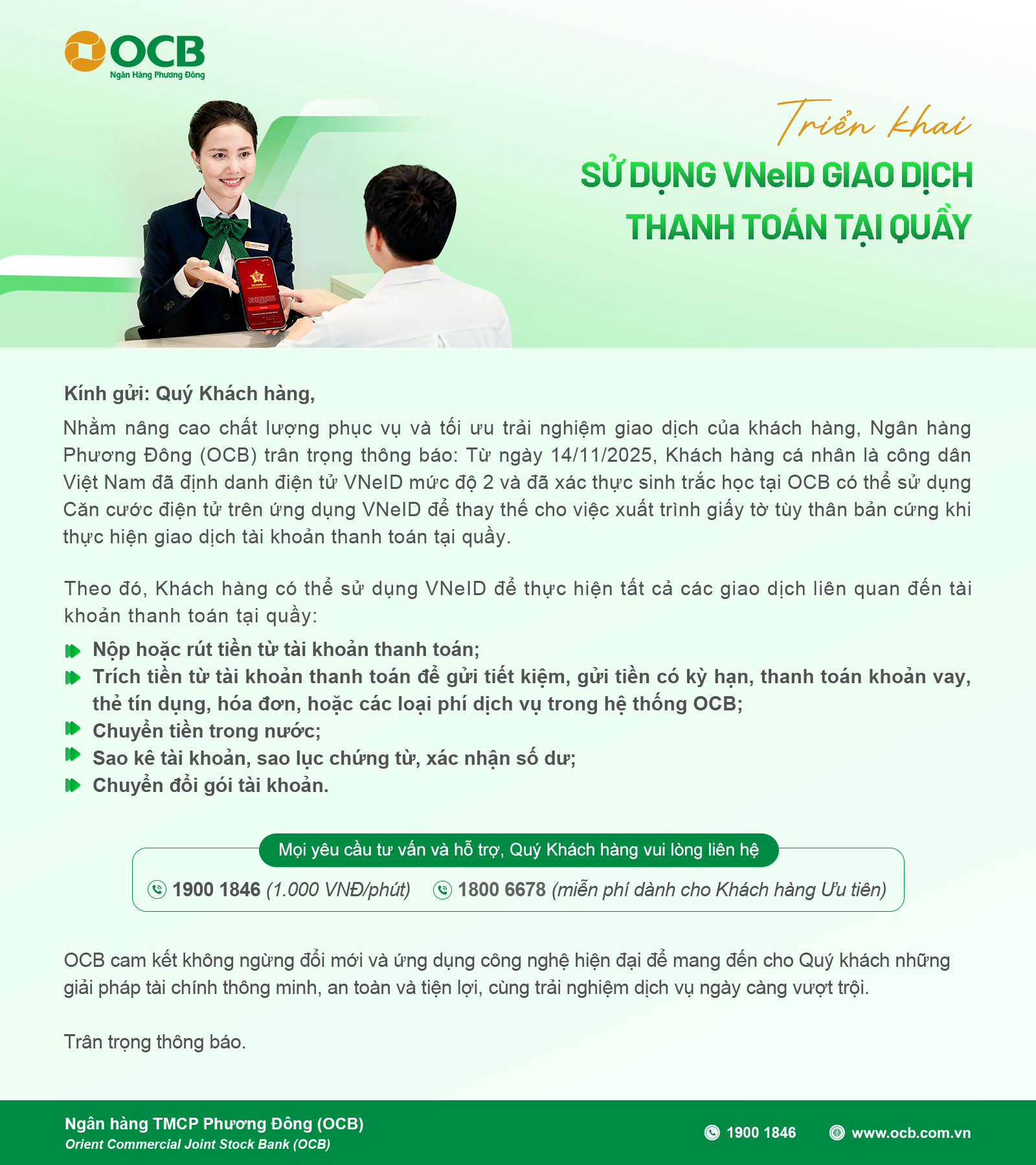 Triển khai sử dụng VNeID giao dịch thanh toán tại quầy