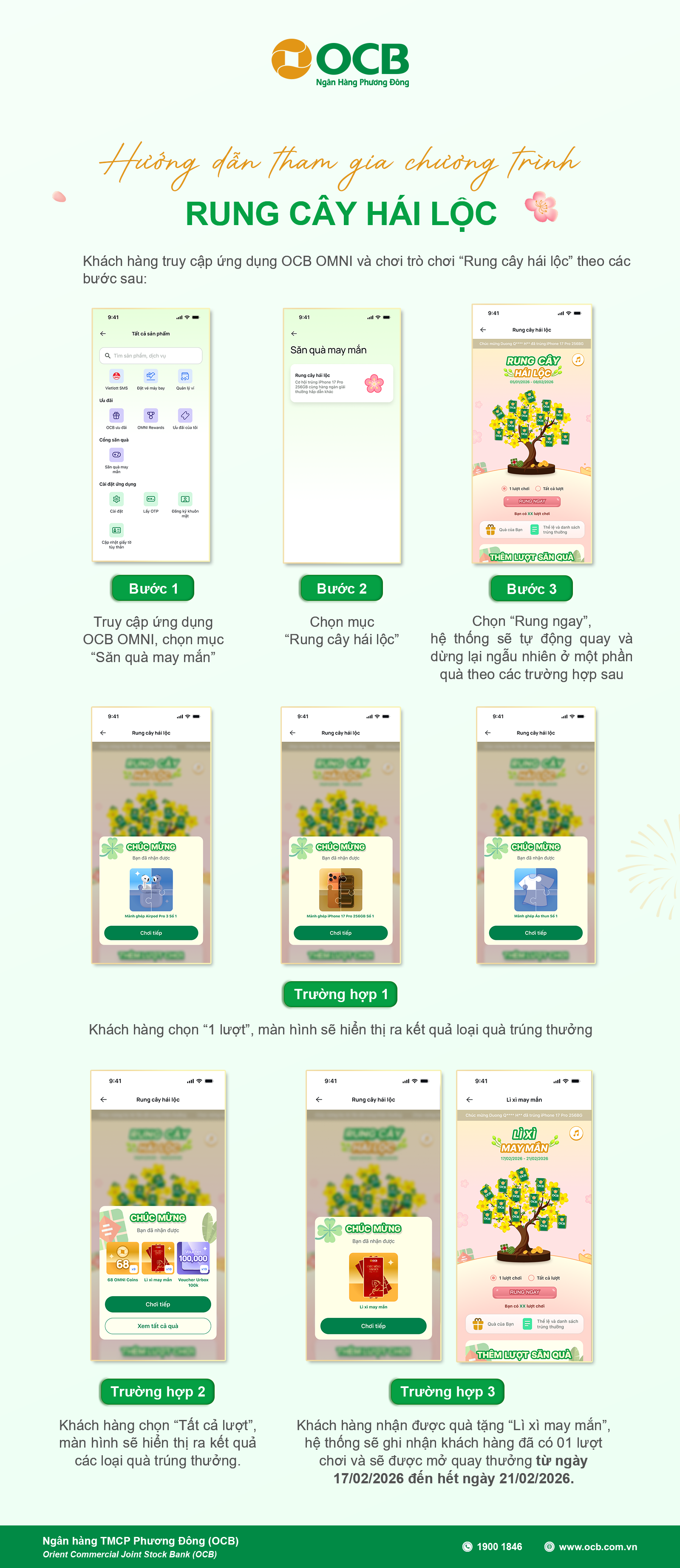 -    Từ ngày 05/01/2026 đến ngày 08/02/2026, khách hàng thực hiện các giao dịch trên ứng dụng OCB OMNI thỏa thể lệ chương trình (*) sẽ được cấp mã lượt chơi để xác định trúng thưởng.