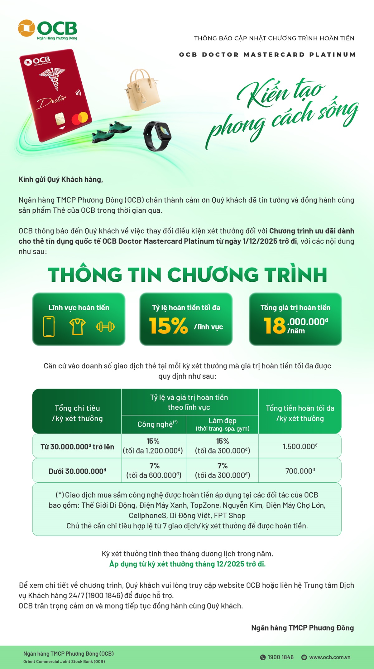 Thông báo cập nhật chương trình hoàn tiền thẻ OCB Doctor Mastercard Platinum