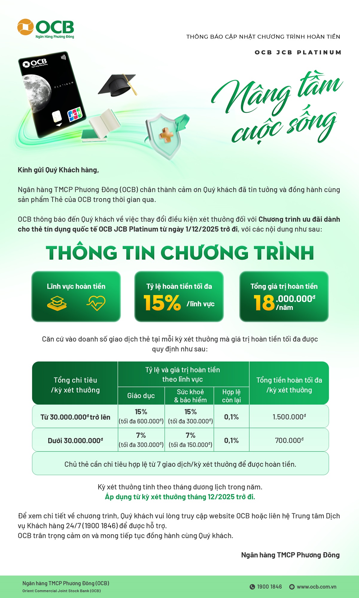 Thông báo cập nhật chương trình hoàn tiền thẻ OCB JCB Platinum