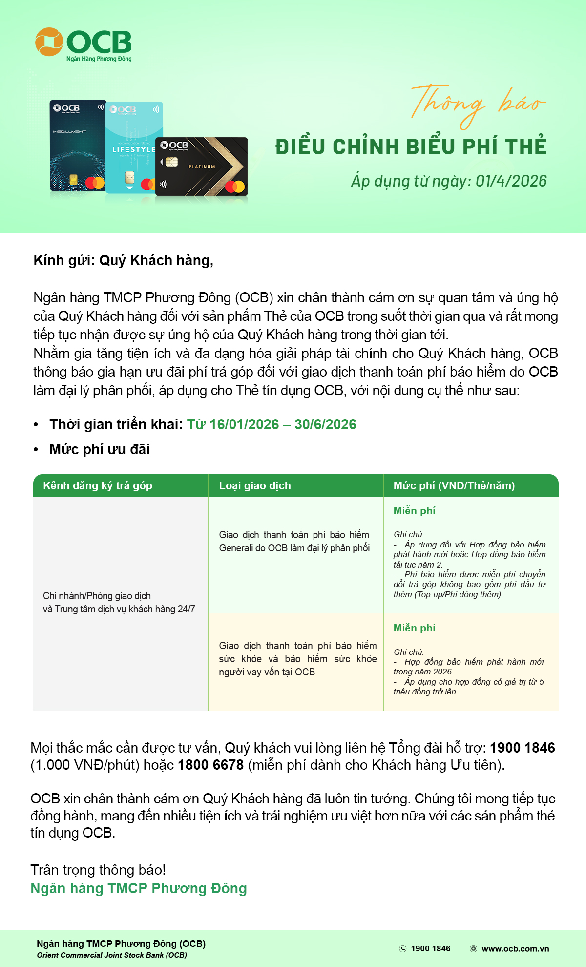 Thông báo điều chỉnh biểu phí thẻ