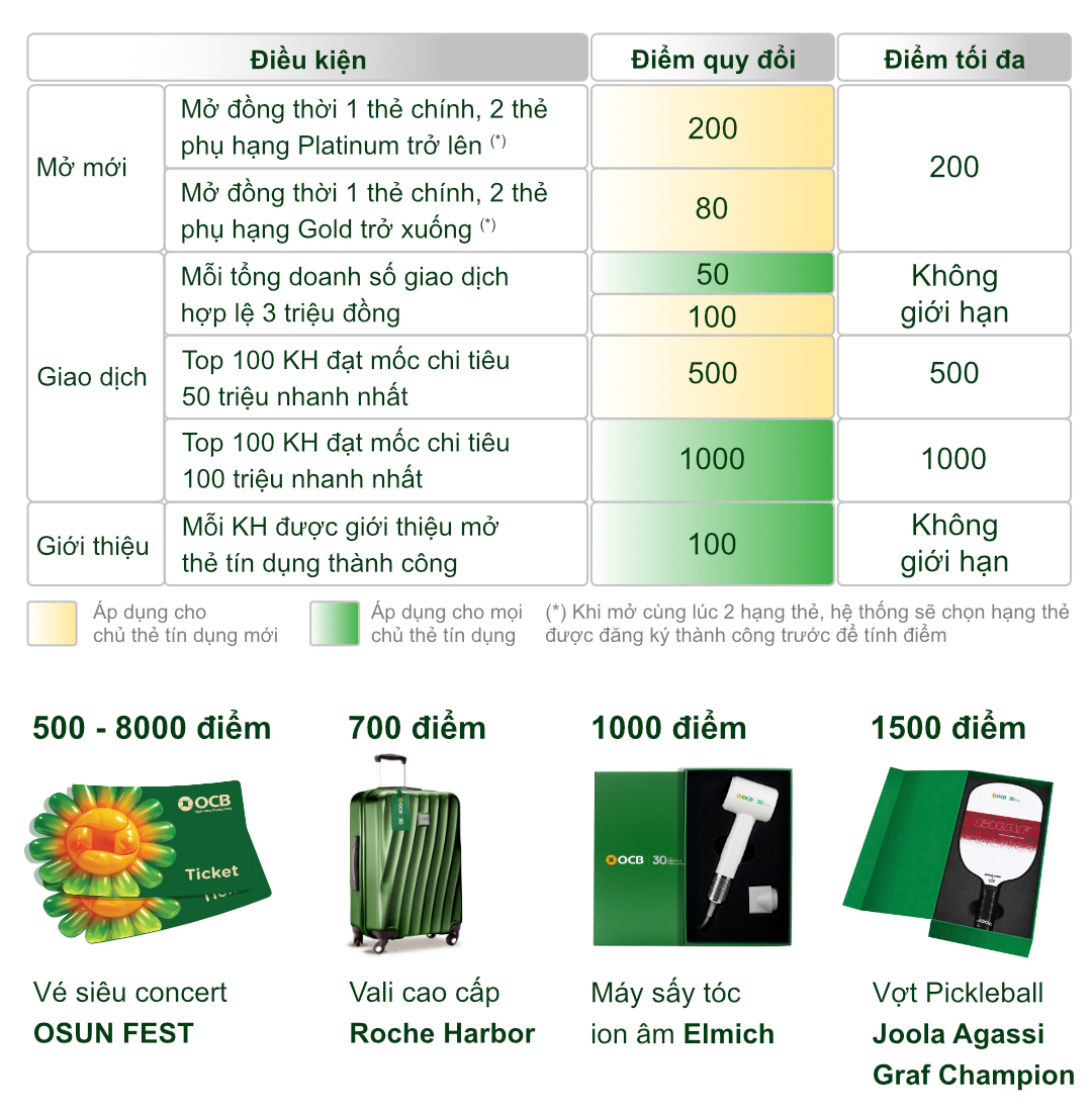 Từ ngày 04/04/2026 đến hết ngày 24/05/2026, chủ thẻ sẽ nhận được điểm thưởng khi mở mới, chi tiêu hoặc giới thiệu mở thẻ. Điểm tích lũy có thể dùng để quy đổi thành vé tham dự concert OSUN FEST hoặc các quà tặng độc đáo. Cụ thể, các nhiệm vụ tích điểm và danh mục quà tặng như sau: