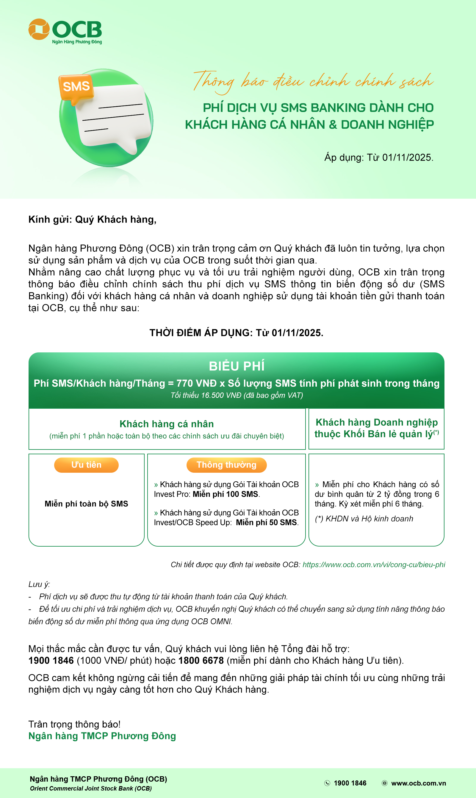 Thông báo điều chỉnh chính sách phí dịch vụ SMS...