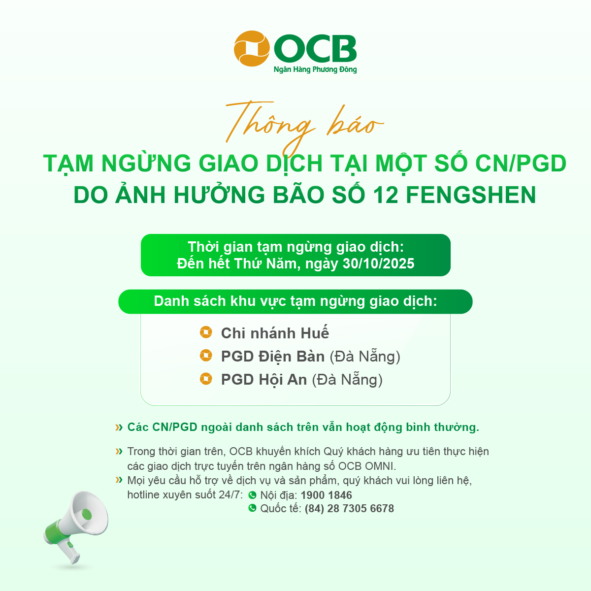 Thông báo tạm ngừng giao dịch tại một số CN/PGD do ảnh hưởng bão số 12 Fengshen