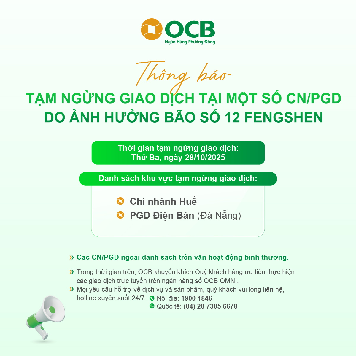 Thông báo tạm ngừng giao dịch tại một số CN/PGD do ảnh hưởng bão số 12 Fengshen