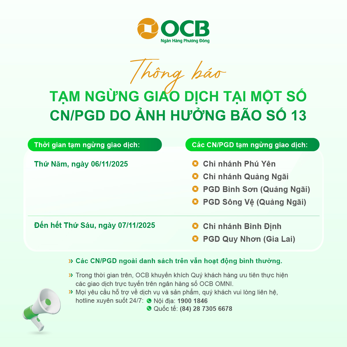 Thông báo tạm ngừng giao dịch tại một số CN/PGD do ảnh hưởng bão số 13